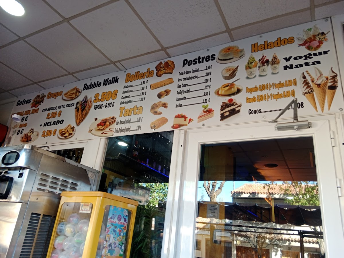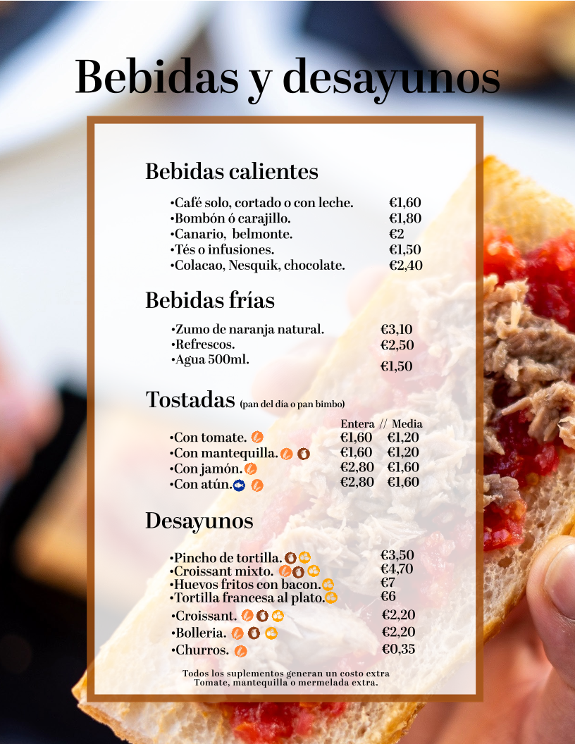 Breakfast (Desayunos): This section features traditional morning choices such as pincho de tortilla, croissants (including mixed croissants), fried eggs with bacon, French-style omelettes, assorted pastries (bolleria), and churros.
