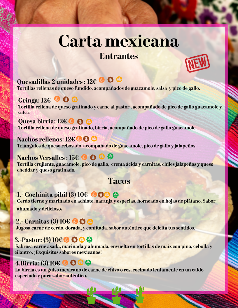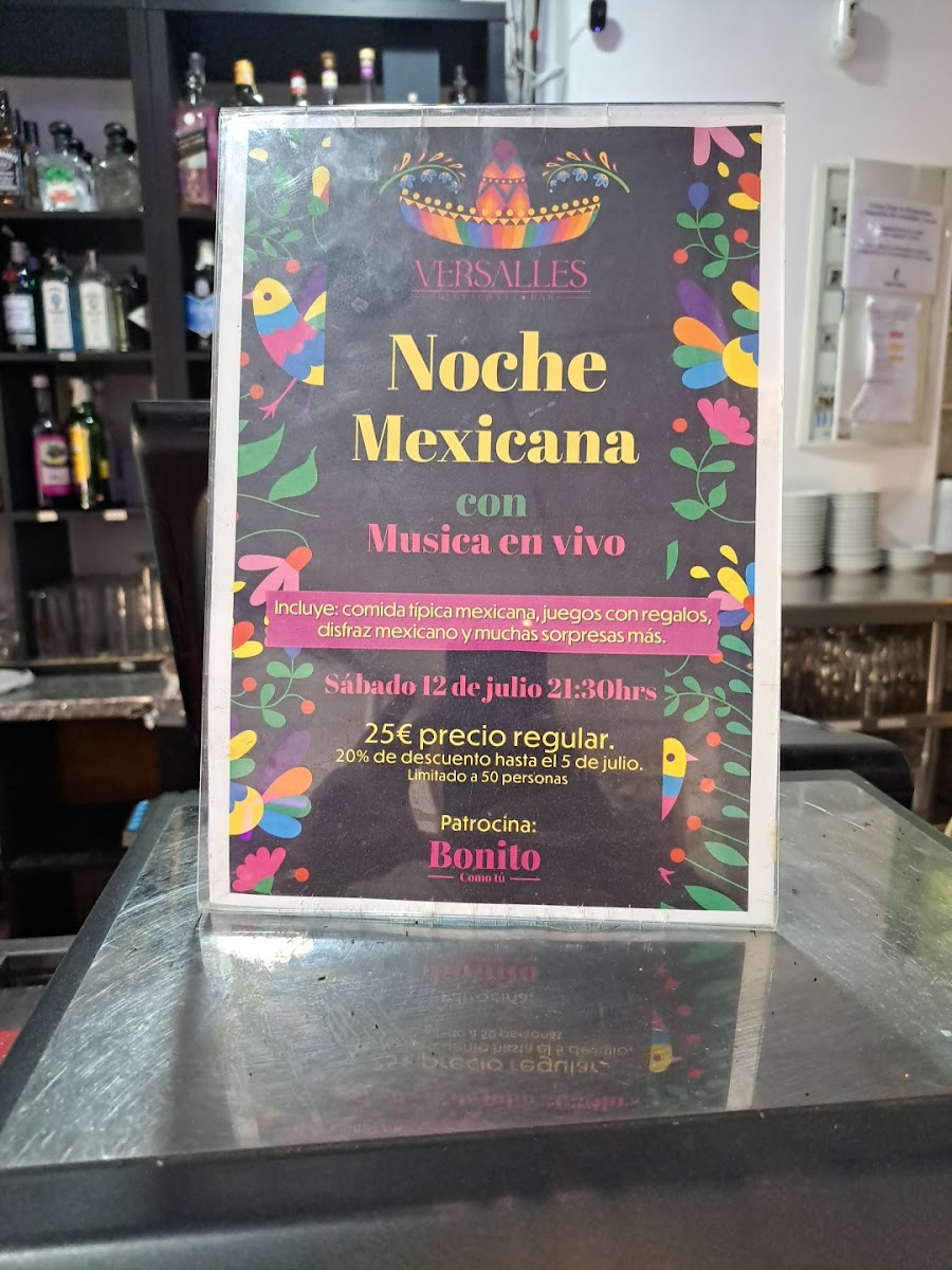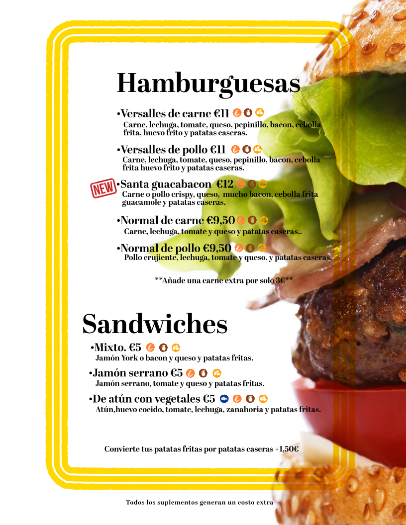 Burgers (Hamburguesas): The burger selection includes variations with beef or chicken, often accompanied by lettuce, tomato, cheese, pickles, bacon, fried onions, fried eggs, and homemade fries. There are several styles available, including the Versalles burger and the Santa Guacabacon with crispy chicken or beef.